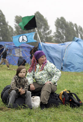 Protesters arrive at the camp for Climate Action on the site of the proposed expansion for Heathrow Airport at Sipson near London August 14, 2007. Hundreds of climate demonstrators set up a tent camp next to London's Heathrow airport on Monday and threatened "direct action" at the world's busiest air hub to protest against global warming. [Reuters]