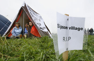 Local villagers of Sipson, (L-R) Lesley Harrison, Lynne Davey and Maxine Payne, join the protest camp at the camp for Climate Action on the site of the proposed expansion for Heathrow Airport at Sipson near London August 14, 2007. Hundreds of climate demonstrators set up a tent camp next to London's Heathrow airport on Monday and threatened "direct action" at the world's busiest air hub to protest against global warming. [Reuters]
