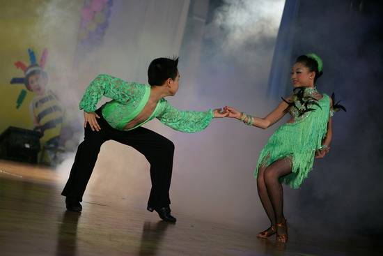 A boy and a girl dance during a performance in Southwest China's Chongqing Municipality August 9, 2007. [Wang Yuanling/Chongqing Times]