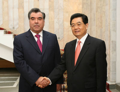 Chinese President Hu Jintao (R) meets his Tajik counterpart Emoamli Rakhmon as they gather for the Shanghai Cooperation Organization Summit in Bishkek August 15, 2007. [Xinhua]