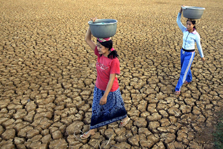 Updated: 2007-08-31 17:46 ![]() Villagers carry water in plastic containers on their heads as they walk through dry land in Maros regency, in Indonesia's South Sulawesi province, August 31, 2007. A prolonged period of dry weather has forced some people to walk two miles (3.2 km) to fetch drinking water, a villager said. [Reuters]