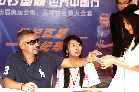 Former Italian soccer star Roberto Baggio gives an autograph to a Chinese fan during a promotion event in Beijing, August 31, 2007. Baggio began his six-day visit to China on Wednesday to promote Olympic commemorative medals. The proceeds from the sales will be donated to charity. [Xinhua]