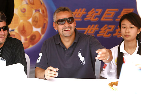 Former Italian soccer star Roberto Baggio meets Chinese fans during a promotion event in Beijing, August 31, 2007. Baggio began his six-day visit to China on Wednesday to promote Olympic commemorative medals. The proceeds from the sales will be donated to charity. [Xinhua]