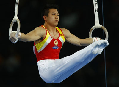 Chen Ybing of China performs on the rings to win the gold medal in the men's final at the 40th World Artistic Gymnastics Championships in Stuttgart September 8, 2007.[Reuters]
