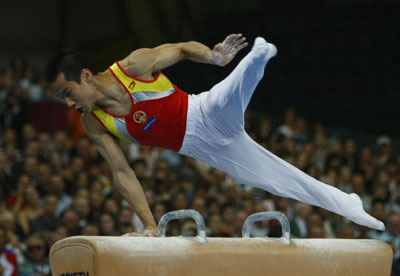 Xiao Qin of China performs to win the gold medal in the men's pommel horse final at the 40th World Artistic Gymnastics Championships in Stuttgart September 8, 2007.[Reuters]