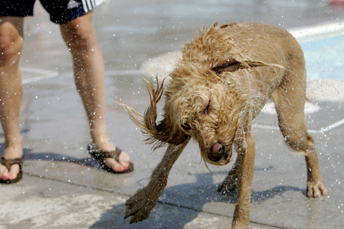 Buddy, a Golden Retriever, shakes itself dry after leaving the swimming pool during Upton Hill Regional Park's annual swim day for dogs in Arlington, Virginia, September 8, 2007. [Reuters]