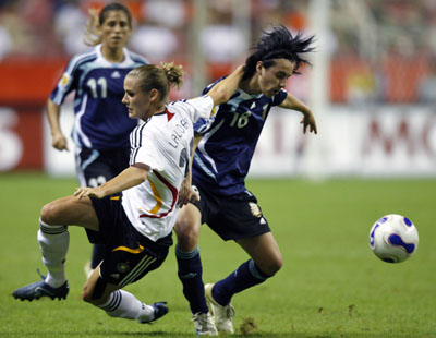 | Germany's Simone Laudehr (L) fights for the ball with Argentina's Maria Potassa during their group match of the 2007 FIFA Women's World Cup at the Hongkou Football Stadium in East China's Shanghai, September 10, 2007. Germany wins the opener 11-0. [Reuters] |