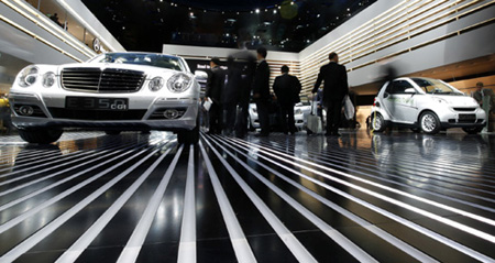 Visitors and journalists walk past displayed Mercedes cars at the Frankfurt International Auto Show IAA in Frankfurt September 12, 2007. [Reuters]