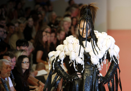 A model displays a creation by Gareth Pugh during his Spring/Summer 2008 show during London Fashion Week September 16, 2007. [Reuters]