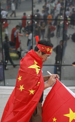 A Chinese supporter carrying a national flag walks past a panel showing reflections of other fans in Tianjin after the 2007 FIFA Women's World Cup scheduled match between China and New Zealand was postponed, September 19, 2007. Host China will have to wait one more day to see if it will qualify for the quarterfinals of FIFA Women's World Cup after a typhoon caused the postponement of group matches. [Reuters]