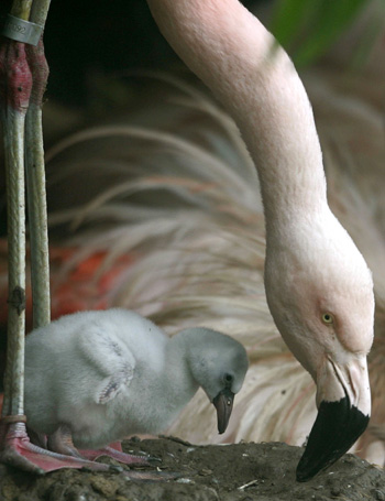 A young flamingo stands next to adults in their enclosure at Zurich's zoo September 19, 2007. [Reuters]