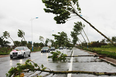 Trees along a street in Rizhao, East China's Shandong Province, are blown down as typhoon Wipha swept across the city on September 19, 2007, packing heavy rainstorms and gale force winds. Wipha, which made landfall in Zhejiang province on Wednesday morning, killed nine and left three missing after lashing across eastern China. [newsphoto]