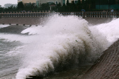 Huge waves batter the sea coast in Qingdao, a port city in East China's Shandong Province as typhoon Wipha moved northwards on September 19, 2007, packing heavy rainstorms and gale force winds. Wipha, which made landfall in Zhejiang province on Wednesday morning, killed nine and left three missing after sweeping across eastern China. [newsphoto]