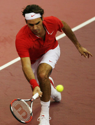 Switzerland's Roger Federer returns a shot to Czech Republic's Radek Stepanek during their Davis Cup group play-off match in Prague September 21, 2007. [Reuters]
