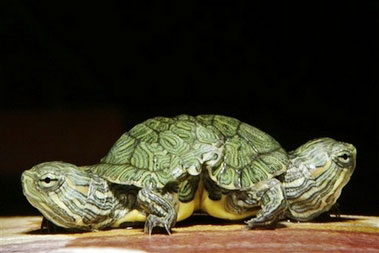 A two-headed red slider turtle is displayed at Big Al's Aquarium Supercenter in East Norriton, Pa., Wednesday, Sept. 26, 2007. [AP]