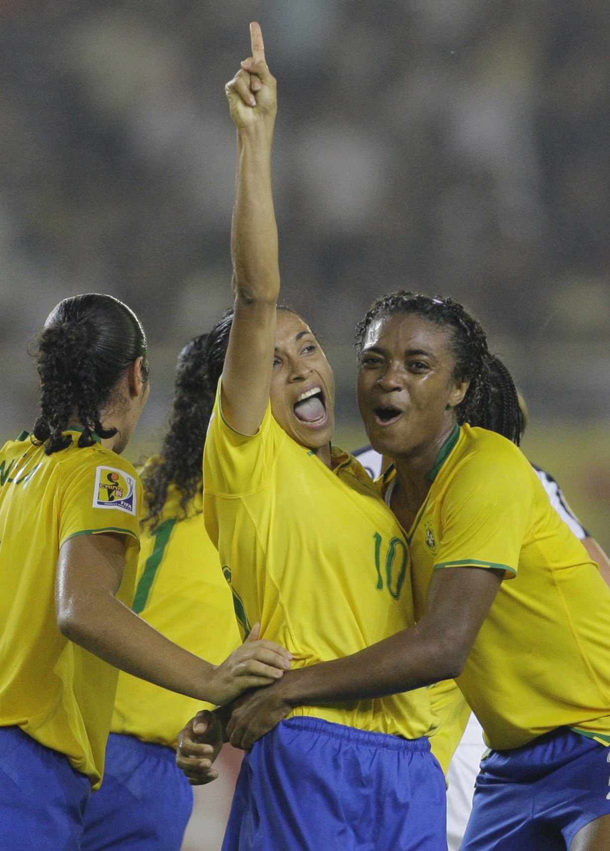 Brazil's Marta (C) celebrates after scoring against the US during their semi-final soccer match of the 2007 FIFA Women's World Cup at the Hangzhou Dragon Stadium in Hangzhou September 27, 2007.  [Reuters]