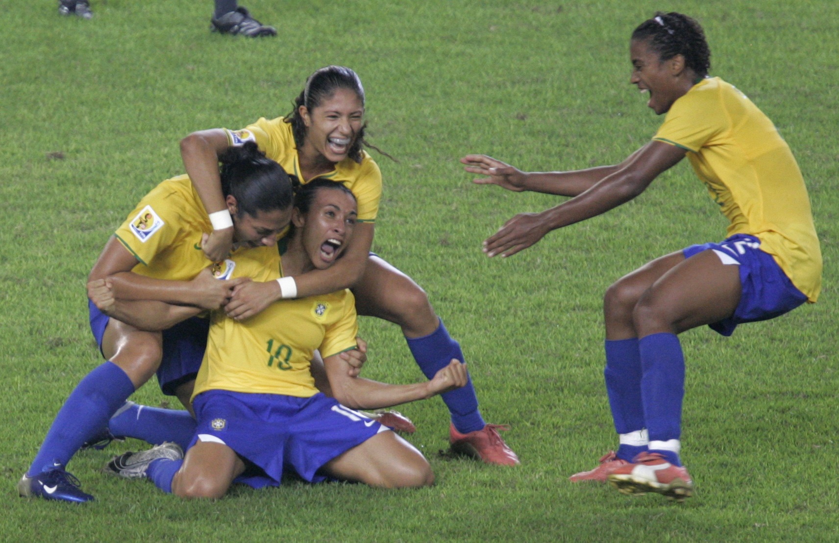 | Brazil's Marta (10) celebrates with her team mate Elaine (R) after scoring against US during their semi-final soccer match of the 2007 FIFA Women's World Cup at the Hangzhou Dragon Stadium in Hangzhou September 27, 2007. [Reuters] |