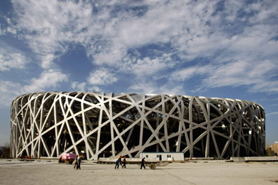 Workers work at the construction site of the National Olympic Stadium, also known as the Bird's Nest, in Beijing September 29, 2007. [Reuters]