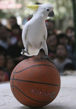 Updated: 2007-10-01 20:49 ![]() A parrot rolls a basketball during a performance at a zoo in Nanjing, east China's Jiangsu Province, October 1, 2007. China is celebrating a week-long National Day holiday, which started on Monday, a time when millions of Chinese travel to major cities to enjoy cultural attractions or return home to visit relatives and friends. [Reuters]
