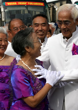 A man helps his wife of 50 years adjust her necklace during celebrations of their 50th wedding anniversary, or "Gold Wedding", in the square of the Great Hall of the People in Suzhou, East China's Jiangsu Province October 9, 2007. The 500 couples were from Suzhou, Zhangjiagang, Changshu, all of which are cities in Jiangsu Province. [newsphoto]
