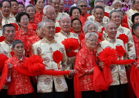 Holding red ribbons, couples gather for a collective ceremony marking their 50th wedding anniversary, or "Gold Wedding", in the square of the Great Hall of the People in Suzhou, East China's Jiangsu Province October 9, 2007. The 500 couples came from Suzhou, Zhangjiagang, Changshu, all of which are cities in Jiangsu Province. [newsphoto]
