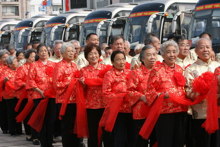 Holding ribbons, couples walk in a procession to celebrate their 50th wedding anniversary, or "Gold Wedding", in the square of the Great Hall of the People in Suzhou, East China's Jiangsu Province October 9, 2007. The 500 couples came from Suzhou, Zhangjiagang, Changshu, all of which are cities in Jiangsu Province. [newsphoto]