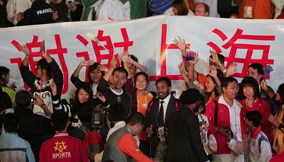 | Special Olympians and other representatives gather at Shanghai Jiangwan Stadium as the 2007 Special Olympics World Summer Games come to an end Thursday, October 11, 2007. The banner behind them reads "Thank you, Shanghai". [Xinhua] |