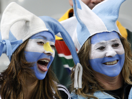 Updated: 2007-10-15 15:47 ![]() Rugby fans with their faces painted in the colours of Argentina attend the semi-final Rugby World Cup match against South Africa at the Stade de France Stadium in Saint-Denis, near Paris, October 14, 2007. [Agencies]