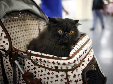 A Persian show cat named Raven looks out from his new $185 cat stroller at the Cat Fanciers' Association show in New York October 14, 2007. [Agencies]