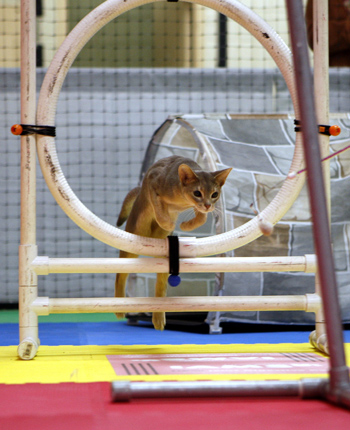 Huey, a Blue Abyssinian show cat, competes in the Feline Agility Competition course at the Cat Fanciers' Association show in New York October 14, 2007. [Agencies]