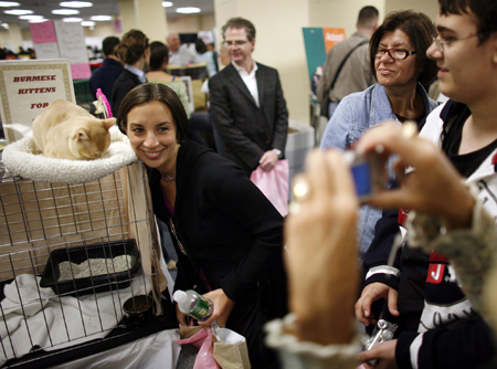 People pose for photos with a Burmese show cat at the Cat Fanciers' Association show in New York October 14, 2007. [Agencies]
