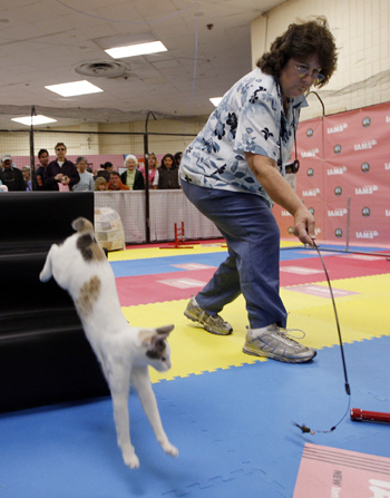 Jill Archibald coaxes Dreamie, a Japanese Bobtail show cat, on the Feline Agility Competition course at the Cat Fanciers' Association show in New York October 14, 2007. [Agencies]