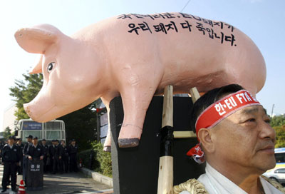 Updated: 2007-10-15 19:23 ![]() A farmer carries a model of a pig during his one-man protest in front of the hotel where South Korean-EU free trade talks are being held in Seoul October 15, 2007. The Korean characters on the model read "EU pigs kill our pigs". The words on the headband read "Oppose the South Korean-EU free trade agreement (FTA)". [Agencies]