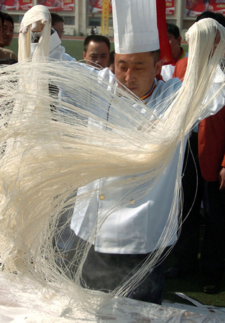 A contestant holds handmade noodles during a contest in preparing food made with flour in Taiyuan, North China's Shanxi Province, October 15, 2007. [Xinhua]