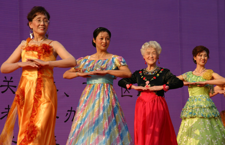 Senior citizens dance during a gathering for the upcoming Chongyang Festival, a traditional day celebrating the elderly on the ninth day of the ninth month according to the lunar calendar, in Nanjing, East China's Jiangsu Province, October 15, 2007. China's aging population is growing rapidly, with seniors expected to account for 30 percent of the Chinese population in 2050, according to figures from the United Nations Population Fund. [Xinhua]