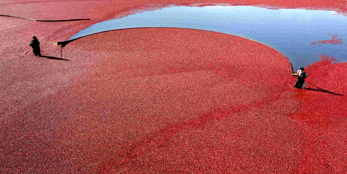 Workers harvest organic cranberries at Canneberges Quebec farm in St-Louis-de-Blandford October 17, 2007. [Agencies]