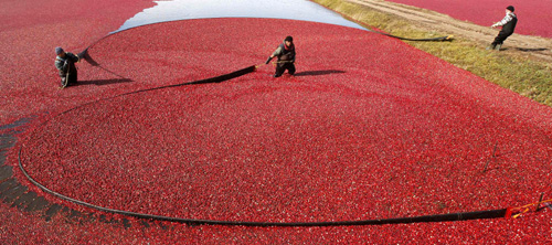 Workers harvest organic cranberries at Canneberges Quebec farm in St-Louis-de-Blandford October 17, 2007. [Agencies]