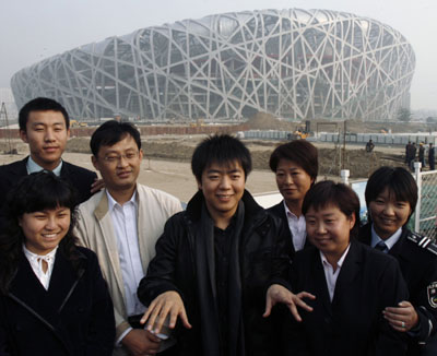 Updated: 2007-10-25 20:15 ![]() Chinese pianist Lang Lang (C) plays an imaginary piano while posing with workers at the National Olympic Stadium, also known as "The Bird's Nest", in Beijing October 25, 2007. [Agencies]