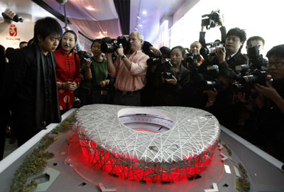 Updated: 2007-10-25 20:15 ![]() A guide (2nd L) briefs Chinese pianist Lang Lang (L) as he looks at a model of the National Olympic Stadium, also known as "The Bird's Nest", during a tour of the Olympic site in Beijing October 25, 2007. [Agencies]