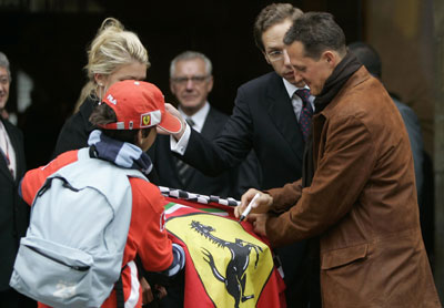 Updated: 2007-10-26 22:15 ![]() Former Formula 1 driver Michael Schumacher from Germany signs a flag for a fan after arriving in Oviedo October 26, 2007. Schumacher is the winner of the 2007 Principe de Asturias Award for the Sports. [Agencies] |