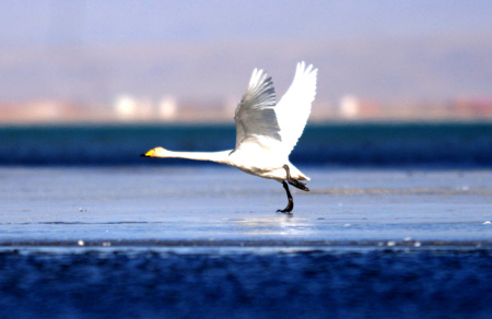 A white swan takes flight from the Qinghai Lake, China's largest salt lake, in Northwest China's Qinghai Province November 13, 2007. Every year, more than 1,000 swans winter at the lake on the Qinghai-Tibet Plateau, making it a beautiful navy-blue swan lake. [Xinhua]