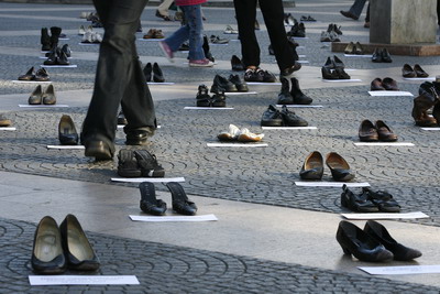 People walk between shoes laid out in remembrance of women murdered by their husbands, during a rally against violence towards women in Vina del Mar city of Chile on November 17, 2007. [Agencies]