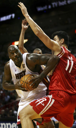 Houston Rockets center Yao Ming (11) from China defends against Miami Heat center Shaquille O'Neal in the first half during NBA basketball action in Miami, Florida, November 23, 2007. The Heat won 98-91. [Agencies]
