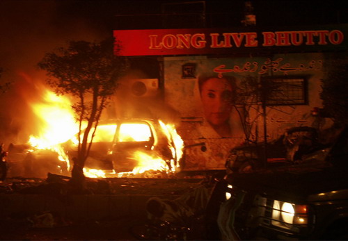 Updated: 2007-12-04 11:06 ![]() A car burns next to a truck which had carried former prime minister Benazir Bhutto during her welcome rally in Karachi October 19, 2007. A suspected suicide bomber killed more than 45 people and wounded 100 in an attack targeting a vehicle carrying Bhutto through Karachi on her return from eight years in exile.