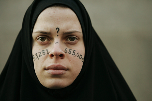 Alicia Casilio, dressed as an Iraqi civilian, stands silently at an anti-Iraq war protest in Boston, Massachusetts January 11, 2007. The numbers on Casilio's face represent the number of Iraqi civilians killed in the war.