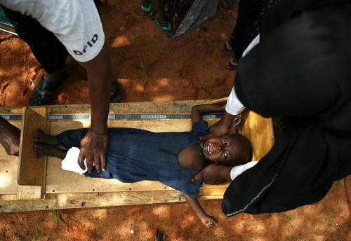 Updated: 2007-12-04 13:25 ![]() A child's height is measured during medical checks and food distribution at a feeding center set up by Action Against Hunger relief organisation to treat severely malnourished children outside Mandera town, 900 km (552 Miles) northeast Nairobi, November 15, 2007.