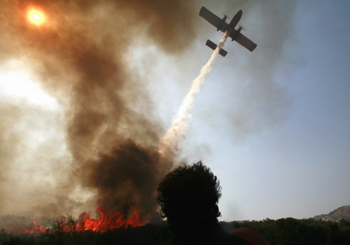 Updated: 2007-12-04 14:16 ![]() A firefighter watches a firefighting airplane unload water during a huge forest fire raging out of control near the village of Karytena in southwestern Greece September 1, 2007. As firemen managed to extinguish most of the massive fires that killed 63 people over the past week, a heat wave accompanied by strong winds ignited new fires in the area.