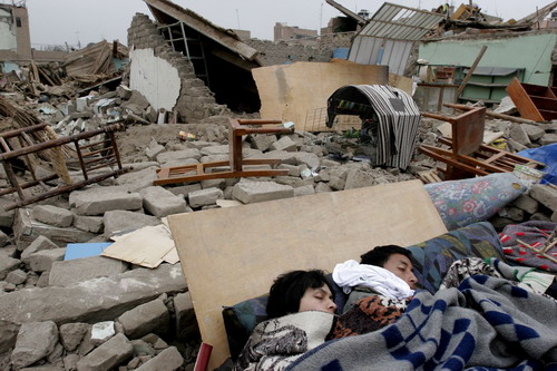 Updated: 2007-12-04 14:16 ![]() A couple sleep in the open amid rubble after an earthquake in Pisco August 18, 2007. Peruvians frustrated over slow emergency aid looted pharmacies and scuffled in food lines on Friday as rescuers picked through rubble for survivors two days after a massive earthquake killed at least 510 people.