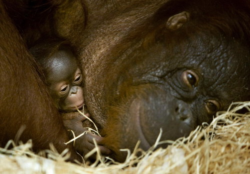 Updated: 2007-12-04 17:08 ![]() Anak, a 31-year-old Orang Utan, holds her five-day-old baby Apie in her arms in Ouwehands Zoo in Rhenen, central Netherlands, July 31, 2007. The baby was born in captivity at the zoo. The zoo participates in the European Endangered Species Programme (EEP), a European breeding program to save the endangered Orang Utans from extinction.