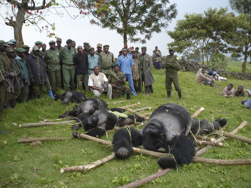 Officials look at four dead mountain gorillas that were illegally killed in the Virunga National Park in the Democratic Republic of Congo during the week of July 26 in this handout photo released by International Gorilla Conservation Programme on August 10, 2007. The silverback male and three females were shot in the southern sector of the park, which contains more than a fifth of the world's population of 700 mountain gorillas, according to World Wildlife Fund.